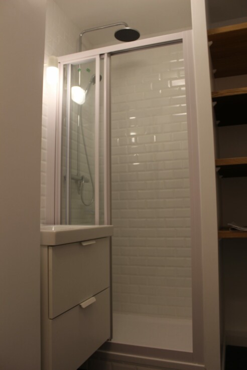L’entrée dessert une salle d’eau moderne avec WC, Une pièce de vie avec un coin cuisine entièrement aménagée et équipée.