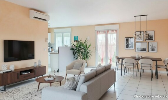 A l’étage, vous bénéficierez d’un séjour donnant sur une véranda de 9m², d’une cuisine indépendante, de trois chambres, d’une salle d’eau ainsi que des toilettes séparés.