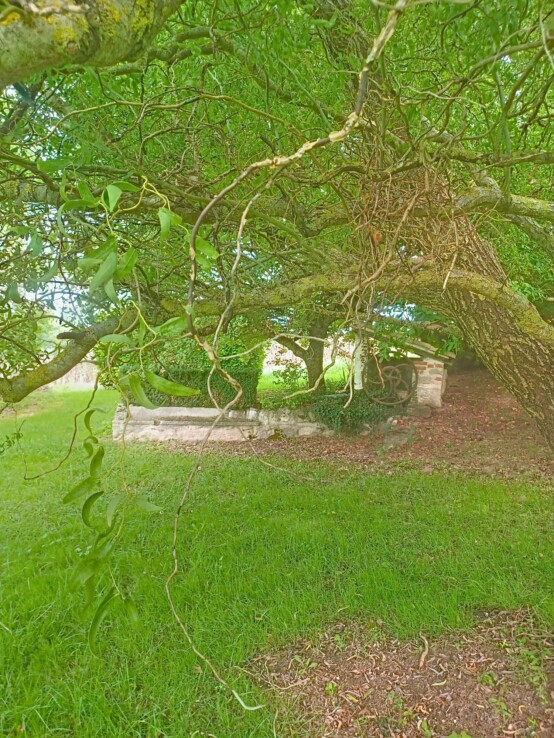 L’extérieur est tout aussi enchanteur avec une terrasse et un jardin de 7700 m², parfait pour les amateurs de nature et les moments de détente en plein air. Un stationnement intérieur pour deux véhicules est également disponible (carport).