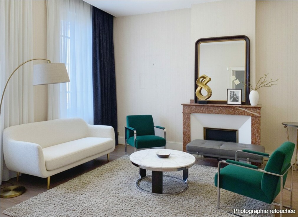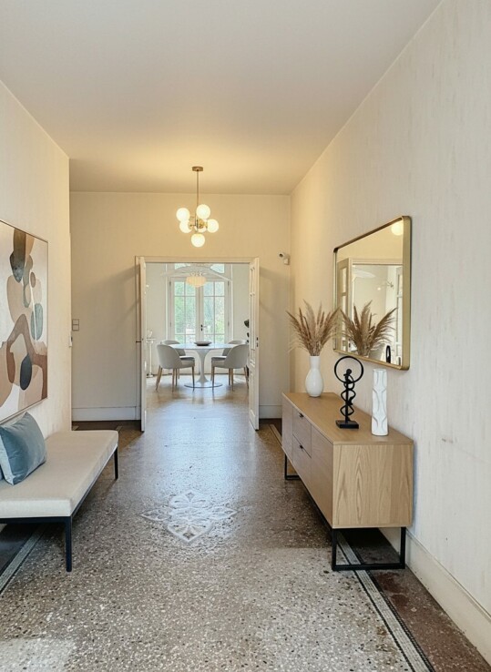 Au rez-de-chaussée, un vaste hall d’entrée de 19 m² dessert un salon, une cuisine et un bureau, tous ouverts sur la terrasse et le jardin, apportant une belle luminosité à l’ensemble.
