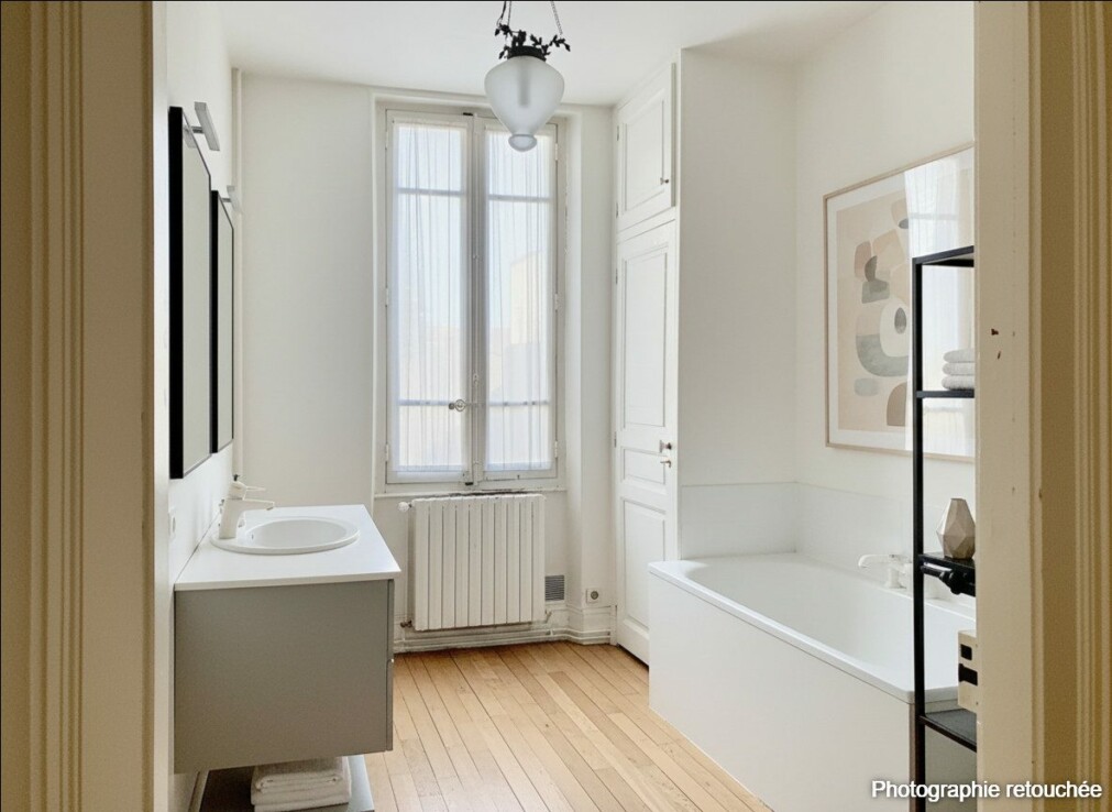 Au premier étage, le palier distribue deux grandes chambres (dont une avec salle d’eau), un bureau ou chambre d’enfant de 10 m², une salle de bain et des toilettes séparées.