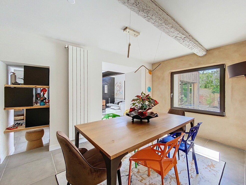 Au rez-de-chaussée, une entrée qui a gardé tout son charme d’antan et qui distribue toutes les pièces à vivre, salon de plus de 40m², cuisine ouverte de 18m², salle à manger de 13 m², le tout ouvert sur le jardin et la piscine. Toujours à ce niveau, un atelier et un grand garage viennent compléter ce tableau.