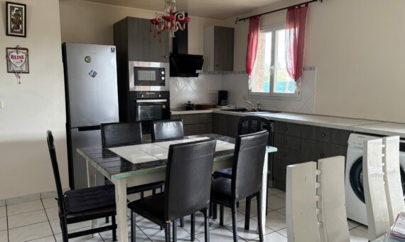 Au rez-de-chaussée, une cuisine de 15 m² (plus cellier, dépendances et salle d’eau), un salon/salle à manger de 45 m² bénéficiant d’une vue dégagée sur la campagne, un garage de 38m².