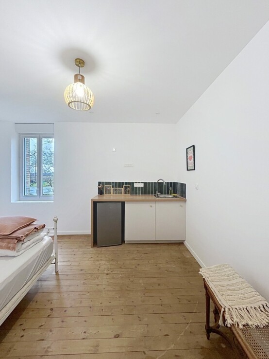 A louer, agréable T1bis de 38m² au 1 er étage d’uneune maison de caractère divisée en plusieurs logements, offrant un cadre de vie calme et plein de charme. Entièrement rénové avec goût, l’appartement se compose d’une cuisine aménagée avec coin repas , une pièce de vis , une salle d’eau avec WC.