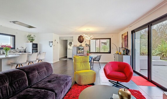 FONSEGRIVES ( PROX CENTRE)/~A 300 m du centre du village, commodités à pieds, MAISON D’ARCHITECTE T5 d’environ 140 m² sur parcelle d’environ 800 m². Séjour avec cheminée, cuisine équipée, 4 chambres, rochelle, lingerie, salle de bains, salle d’eau, 2 WC. ~Garage 2 véhicules, terrasse. Au calme. Libre le 10/02/2026.